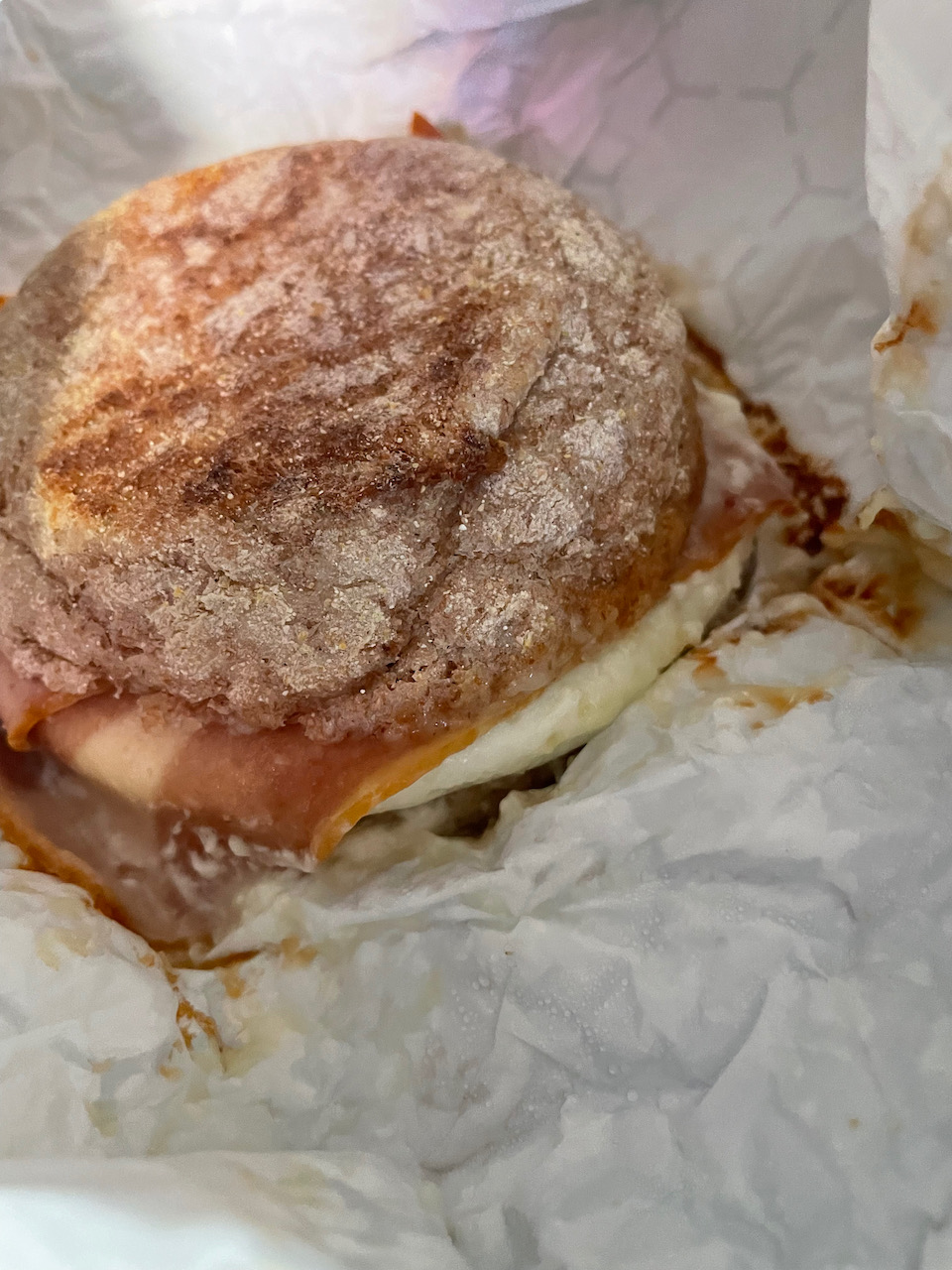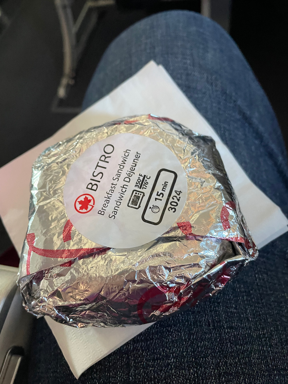 When the buy on board came by I tried the breakfast sandwich, consisting of turkey, egg and bacon. She had a cheese and fruit snack box.