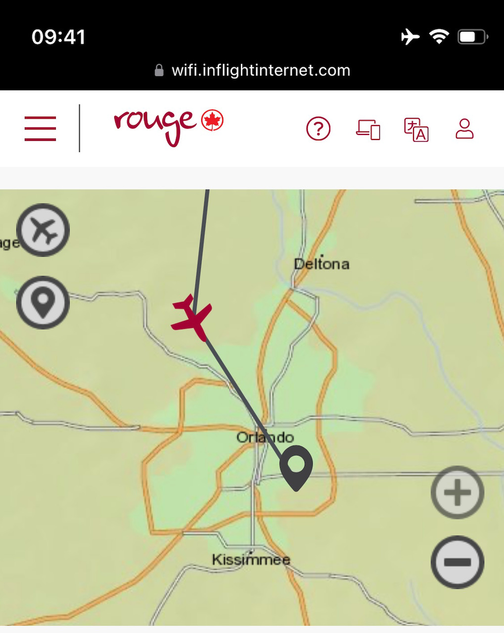 Overall the flight was fine, there was some light turbulence somewhere over Georgia, however I just remember that a flight attendant had just past offering water when the plane encountered the turbulence. Approach into Orlando was straight forward. With no seat back screens, Rouge does offer a library of entertainment accessible by wifi as well as a map. It is possible to pay for a wifi connection, however I enjoy not having an internet connection when on flights.