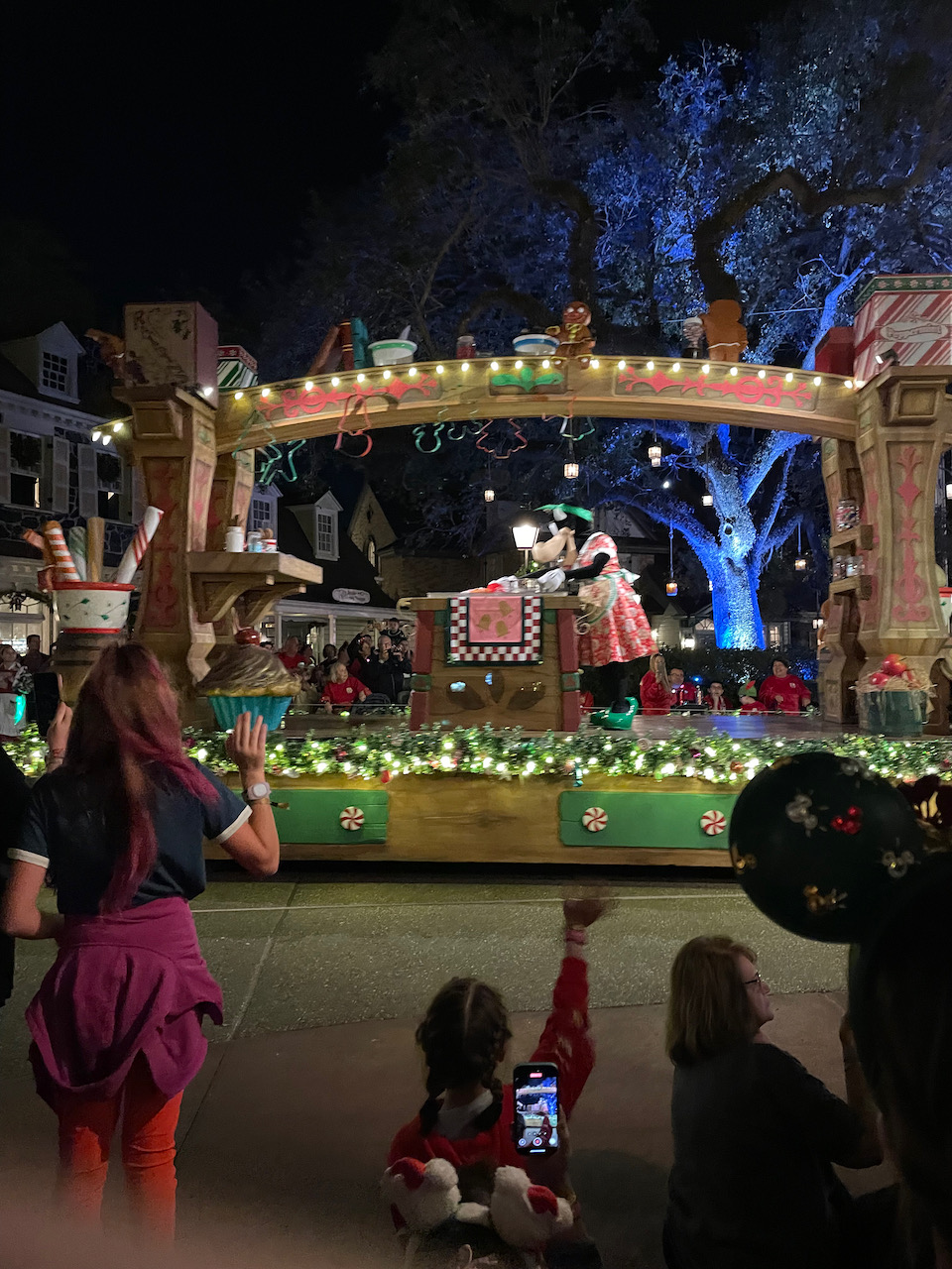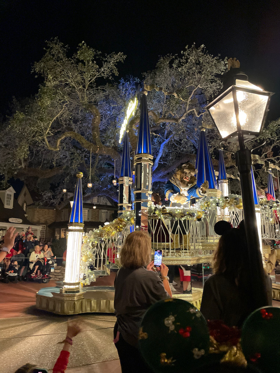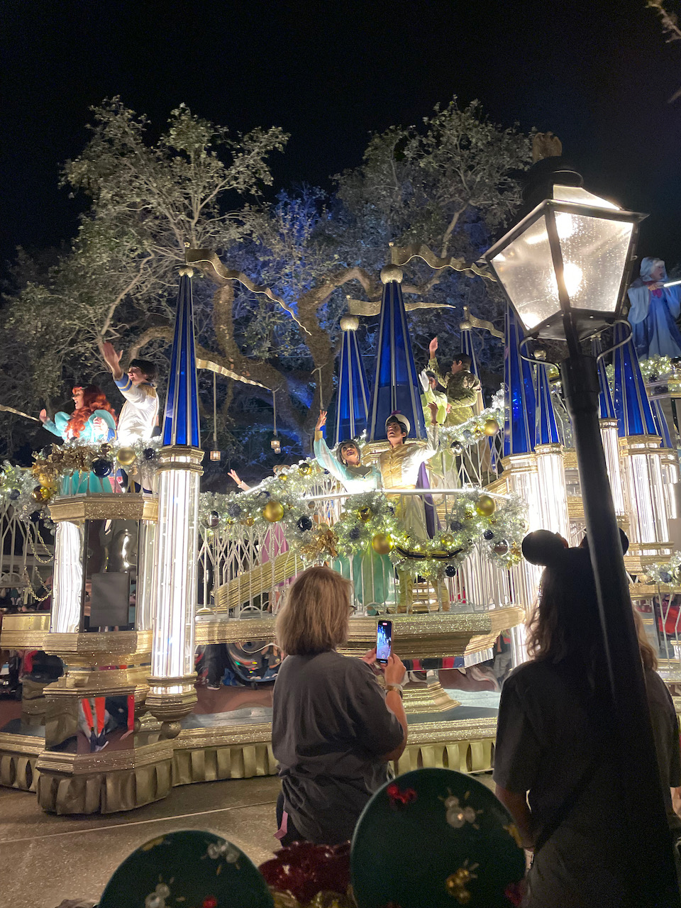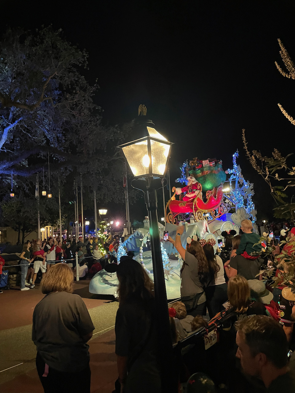 In 2024 Disney offered “Mickey’s Very Merry Christmas” at Magic Kingdom, and on alternating evenings another themed event was at Hollywood Studios. We selected Magic Kingdom largely because, it’s Magic Kingdom — the original theme park to Walt Disney World. Also with the prospect of having shorter waits for rides, this park had rides that we’d both enjoy. This was our first visit by car and after parking your car, a shuttle delivered us to the terminal to take a ferry across the water to the main entrance.