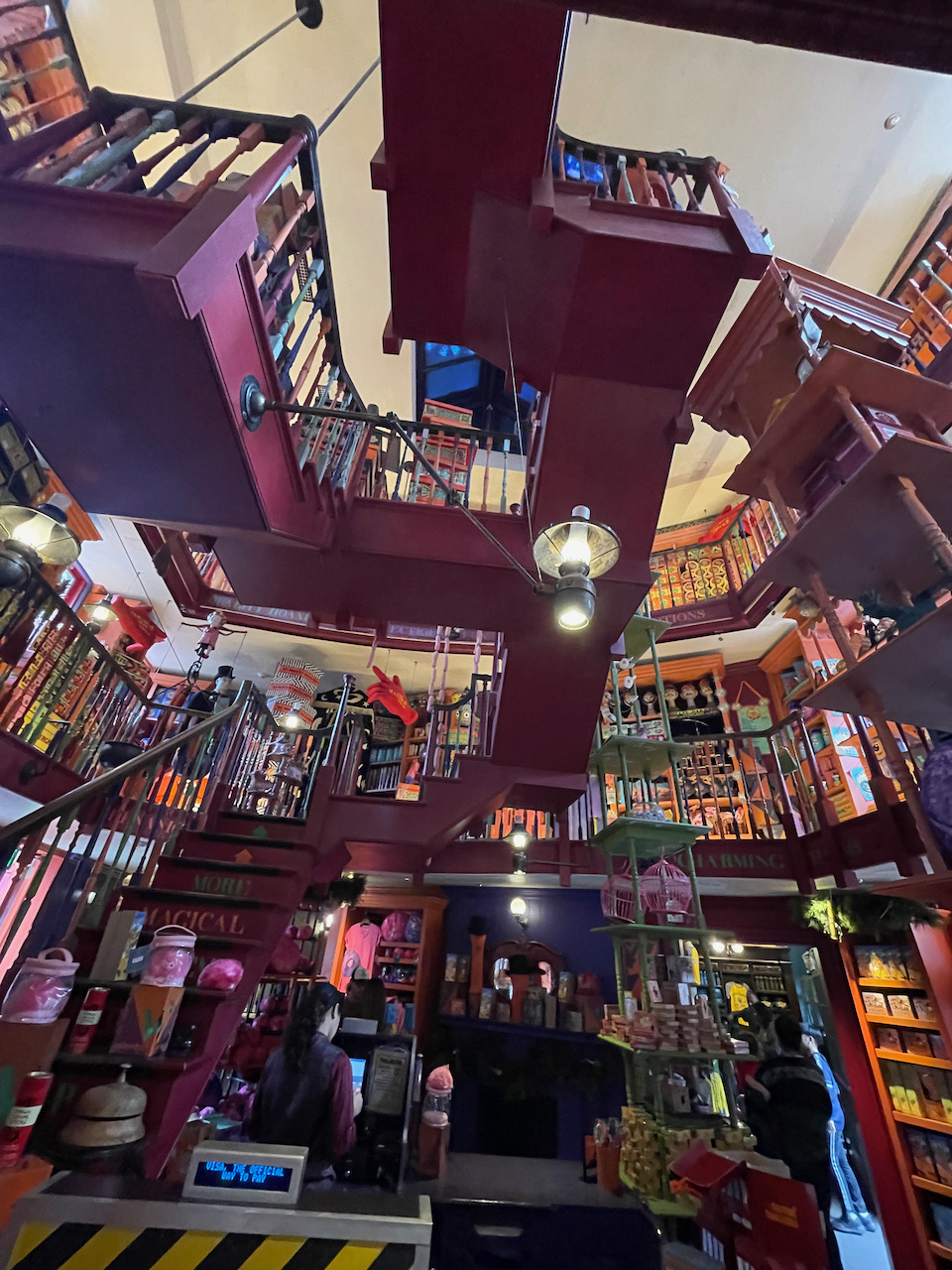 The stand-out about the Alley is not just the outside space, but the fact that the storefronts are truly stores and true to the movies. We enjoyed walking through each of the shops, and like the movie version there were unique items available in each store. By far, the store that created the most excitement was Ollivanders Wand Shop. Both of us enjoyed the movies but neither of us saw a requirement to purchase a wand while visiting the store. (Slideshow below)
