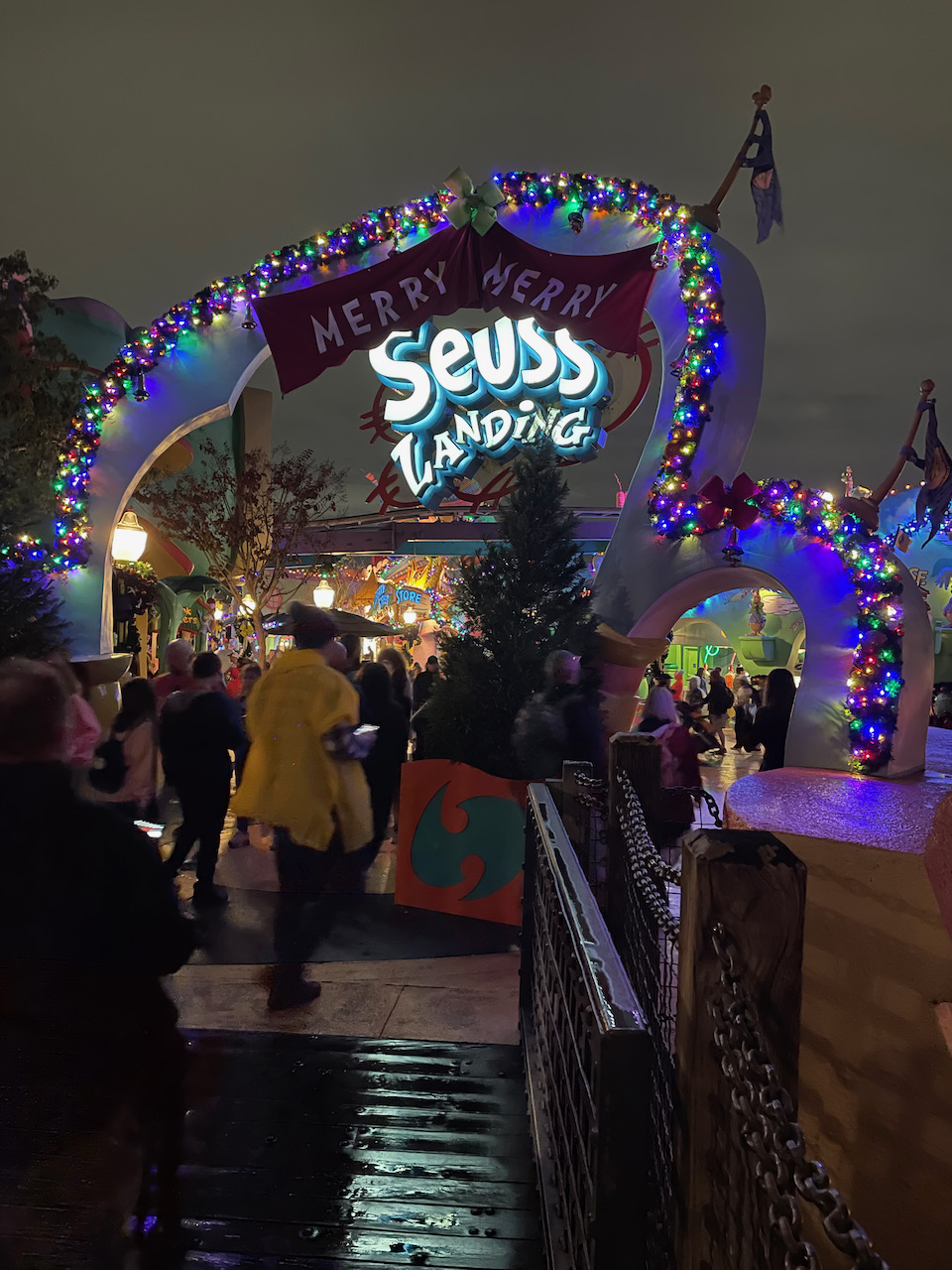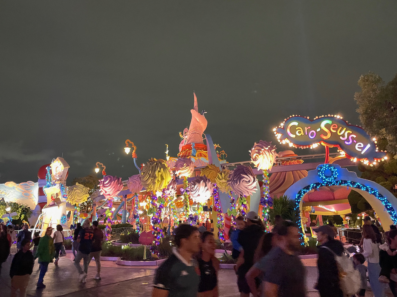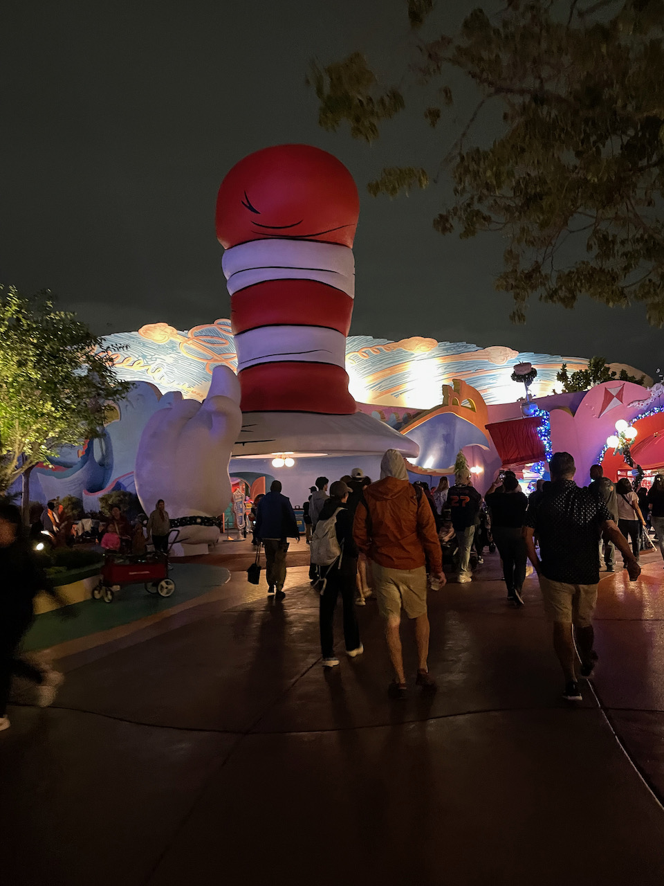 Our path to exit the park had us going through Seuss’ Landing. It was cute, and given the time of day — the sun had set and some families had departed for the day — we did go on one of the rides. Here’s a slideshow while we walked through it: