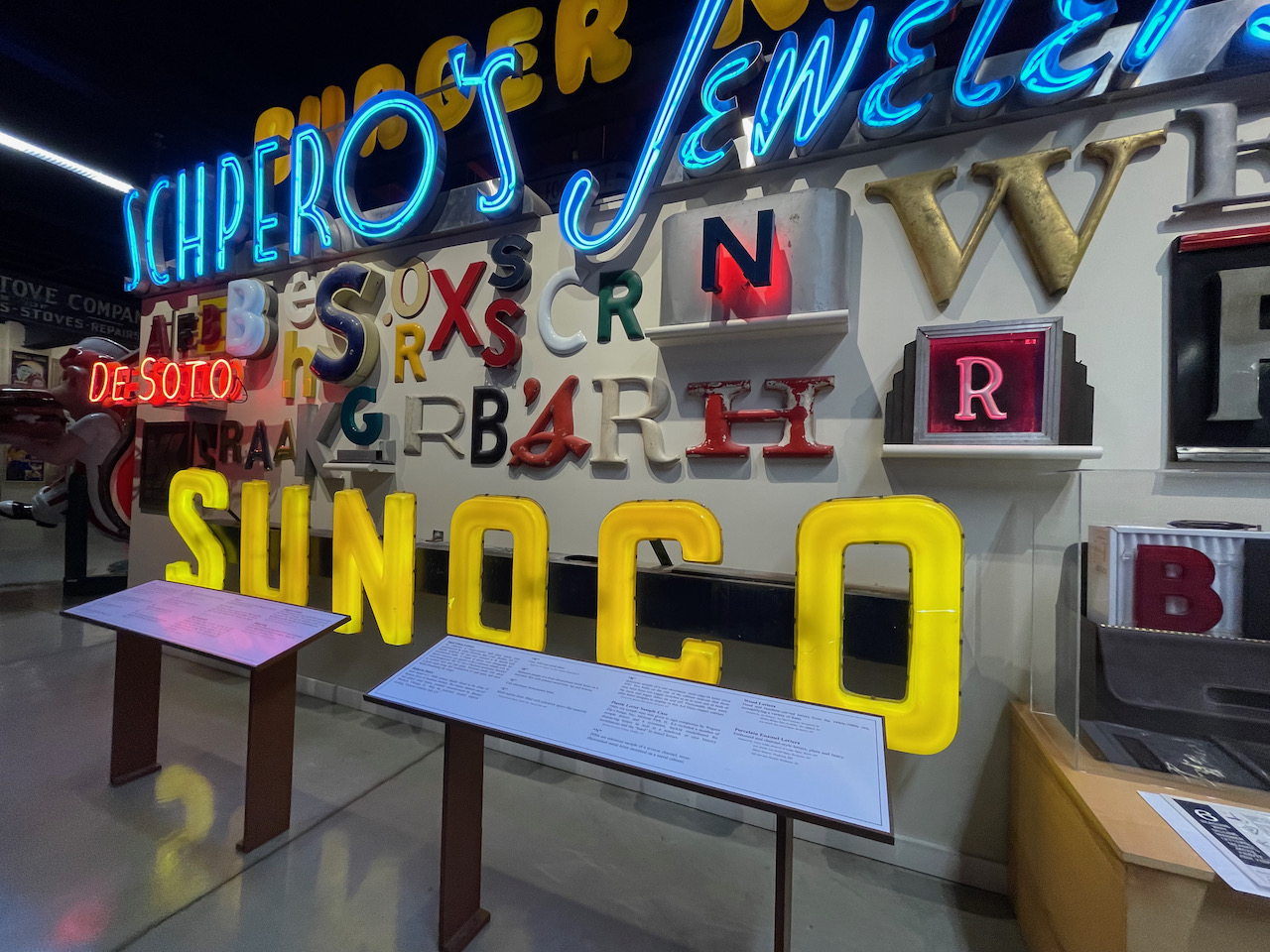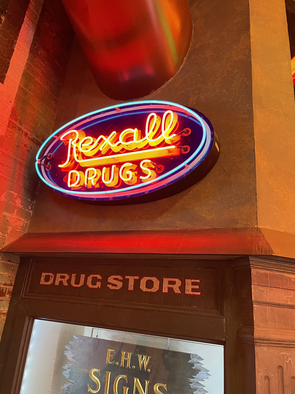 The easiest way to sum up the museum, was that a sign company happily adopted signs as the old ones were being replaced. Eventually, the company realized that the old signs were valuable to show the evolution of design, lighting, and uniqueness of them. There are signs everywhere! Although the most eye-catching were neon signs from the 1950s and newer, the older signs definitely earned their place. The setup was well done enabling each sign to have their space. This space challenge grew as some signs were quite large. Here’s a slideshow of pictures from the museum: